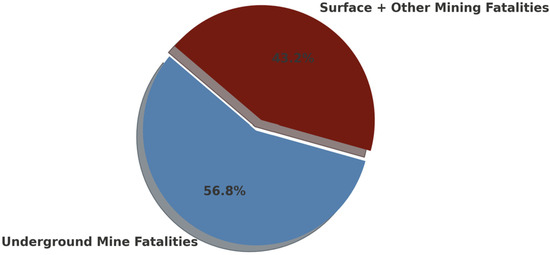 2], there has been a significant reduction in both the absolute number of fatalities and the fatality rates over the past four decades. Total mining fatalities have decreased from approximately 250 per year in the late 1970s to below 50 in recent years, while underground mine fatalities have seen a similar downward trend, dropping from over 140 fatalities per year in the early 1980s to fewer than 15 per year in recent years. Furthermore, the pie chart depicting the proportion of underground versus total mining fatalities during the period from 1978 to 2023 illustrates that underground mining accounted for approximately 57% of all mining fatalities. This highlights the critical need for continued improvements in underground mine safety to drive further reductions across the sector.