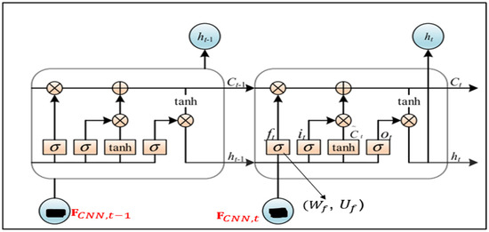 , , and are the input, forget, and output gates, respectively; is the candidate cell state; is the updated cell state; is the current hidden state; ⊙ denotes element-wise multiplication; σ and tanh are the sigmoid and hyperbolic tangent activation functions. , : Weight matrices for input, forget, output, and cell gates, respectively; , : Weight matrices for hidden state; , : bias terms.