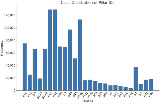 Figure 7 illustrates the class distribution of the pillar IDs in the training dataset, representing the ground truth locations that the model is trained to predict. This visualization helps assess the balance of samples across different pillar locations. The distribution is highly imbalanced, with a few pillar IDs (e.g., p51, p52 and p130) accounting for a disproportionately large number of observations, while many other locations have relatively few instances.