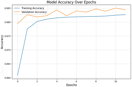 Figure 10 shows the model accuracy on the training and validation sets across epochs. Both metrics improve steadily, with validation accuracy peaking at approximately 88.5%. The training and validation accuracy exhibit a consistent increase, as illustrated in