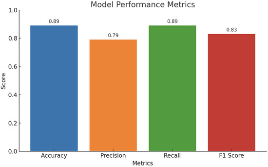 Figure 11 represents the model performance metrics (Accuracy, Precision, Recall, F1-Score). This bar chart compares the overall performance metrics of the model: Accuracy: 89%, Precision: 79%, Recall: 89%, and F1-Score: 83%. High recall indicates the model captures most true positives effectively. Critical for applications where missing a class prediction (false negatives) is more costly than predicting extra classes (false positives). A moderate precision suggests the model occasionally predicts false positives, which could be problematic in high-stakes scenarios.