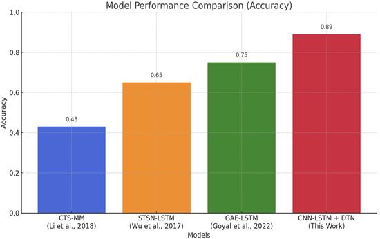28] achieved an accuracy of approximately 43%, largely limited by its inability to learn spatial relationships or complex sequential patterns. STSN-LSTM, developed by [