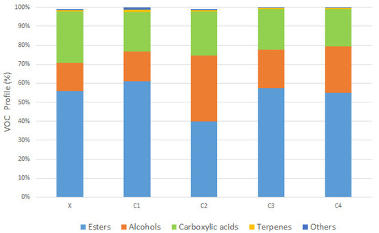 The Volatile Organic Compounds (VOCs) identified are reported in Table 2. C1 showed a higher concentration of esters and a lower concentration of carboxylic acids, whereas C2 showed a higher concentration of alcohols (Figure 1). Likewise, C3 and C4 showed a higher alcohol concentration, compared to X.
