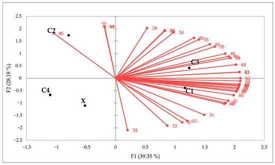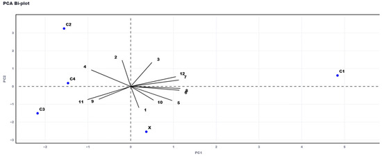 Principal Component Analysis (PCA) biplot of VOC profiles from wheat beer samples. Blue circles represent individual beer samples, labeled according to sample codes (X: control; C1: Tricu Cossu beer; C2: Trigu Murru beer; C3: Trigu Denti de Cani beer; C4: Trigu Moru beer). Black arrows indicate the variable loadings of VOCs, each labeled with a number. The direction and length of each arrow represent the contribution and correlation of each compound to the first two principal components (PC1 and PC2). VOCs are labeled numerically as follows: 1—n-Decanoic acid; 2—3-methylbutan-1-ol; 3—2-methylbutan-1-ol; 4—2-phenylethan-1-ol; 5—3-methylbutyl ethanoate; 6—2-methylbutyl ethanoate; 7—ethyl hexanoate; 8—ethyl octanoate; 9—phenethyl acetate; 10—ethyl decanoate; 11-ethyl dodecanoate: 12-linalool.