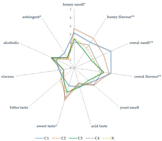 The control beer (X) was intermediate, with no significant standout attributes. ANOVA of the seven-point intensity scores revealed significant effects (p < 0.05) for honey odor/flavor (F = 10.21), cereal flavor (F = 8.57), and astringency (F = 51.13). Replicate and interaction terms were non-significant, confirming panel reliability.