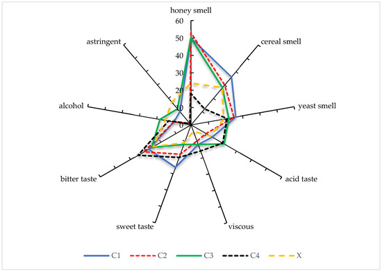 Selection-frequency analysis (McNemar–Bonferroni) of the attributes showed that honey smell and cereal smell were significantly (p < 0.01) more often associated with C1– C3 than with C4 and X (Table 3). Acid was a frequently selected taste for C3 and C4 and bitter for C2 C4, paralleling trained-panel bitterness scores. Sweet taste was linked mainly to C1 and C4, while astringency was more often chosen for X and C3. Among the aromatic descriptors, ‘honey smell’ was the most frequently associated with samples C1, C2, and C3, suggesting these beers were perceived as more aromatic and floral. In contrast, C4 and the control sample (X) received significantly fewer mentions, indicating a lack of this desirable aromatic note.