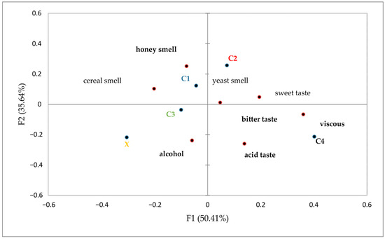 The correspondence analysis (CA), shown in Figure 5, explained over 86% of the total variance, reflecting strong discriminatory power of the sensory attributes across beer samples. Dimension 1 mainly distinguished C1 and C2 from C4 and X, driven by opposing descriptors such as “honey” and “cereal” versus “astringent” and “bitter”. Dimension 2 captured additional variance related to viscosity and alcohol perception.
