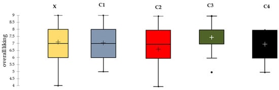 Box plots were constructed for each beer sample (Figure 6), showing the median, mean, interquartile range, and outliers. Sample C3 demonstrated the highest median (approximately 8.0) and mean (around 7.5), indicating the strongest overall preference among participants. However, the presence of a single low outlier suggests a potentially polarizing attribute. Samples X and C1 showed nearly identical profiles with median and mean scores around 7.0–7.2, suggesting stable and generally favorable evaluations with minimal variability and no outliers. Sample C2, despite sharing the same median (7.0), exhibited a lower mean (approximately 6.8), suggesting a slight skew toward lower ratings among some respondents. This implies a more heterogeneous perception.