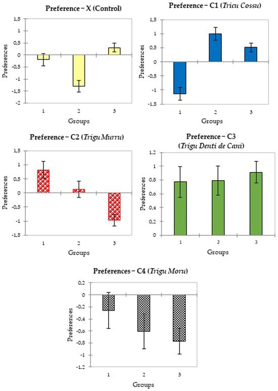 The aim of this study was the investigation of the chemical and sensorial profiles and the acceptability of beers obtained by unmalted old Sardinian durum (Trigu Murru, Trigu Moru) and soft (Trigu Denti de Cani, Tricu Cossu) wheat varieties. The old durum wheat variety Trigu Murru was among the landraces already present in Sardinia before 1925 [32]. Trigu Moru, Tricu Cossu, and Trigu Denti de Cani are all included in the Regional Repertoire of Agrobiodiversity established by the Sardinian Regional Council with the aim of protecting the biodiversity of its territory from an economic, scientific, cultural, and environmental perspective [33]. The soft varieties (Tricu Cossu and Trigu Denti de Cani) are used for bread and sweet production but have always represented a marginal part of wheat production in Sardinia [34].