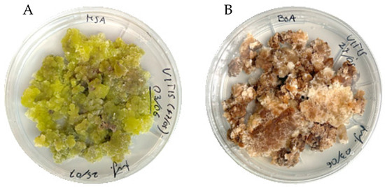 V MSA—green and juicy callus cultured in MSA medium (A); V B5A—white and brownish callus cultured in B5A medium (B).