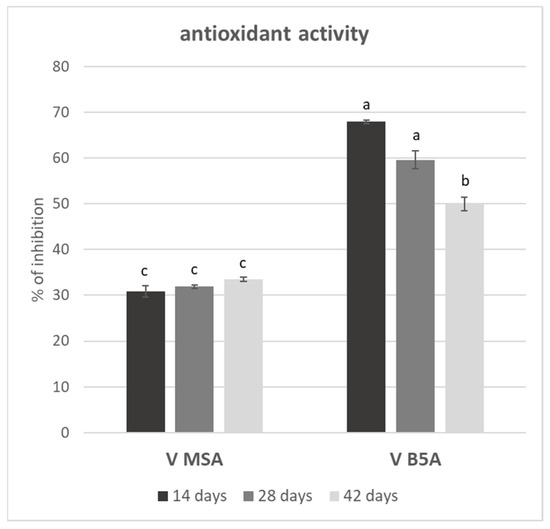 Figure 3 shows the antioxidant activity of V MSA and V B5A juices, each harvested after 14, 28, and 42 days of cell growth. The antioxidant activity is expressed as the percentage of DPPH inhibition (discolouration) of 25 µL of juice.