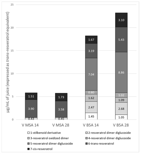 From Figure 5, it is clear what was already reported: the qualitative richness of V B5A juice compared to V MSA. V B5A showed a greater amount of a resveratrol dimer diglucosylated (compounds 2), both at 14 and 28 days, and a greater content of the trans-resveratrol (compound 6), at 28 days of growth, compared to the other juices. Additionally, the content of cis-resveratrol (compound 7) was almost twofold at 28 days in V B5A, compared to the other juices. Moreover, V B5A juice exhibits an interesting amount of compound 5, not present in V MSA, which is a diglucoside derivative of resveratrol. The glycosylated bioactive compounds can exhibit increased water solubility, physicochemical stability, intestinal absorption, and biological half-life, thereby improving their bio- and pharmacological properties. The glycosylation of stilbenoids can overcome the water insolubility of these compounds, thereby increasing their pharmacological potential [80].