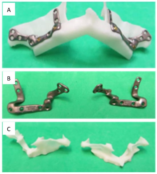 (A) Splints fixed on the model, (B) fixation splints and (C) surgical guide template for osteotomies.