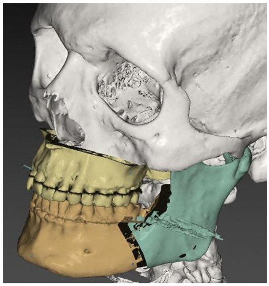 For patients of group A, an intraoral incision was made in the upper vestibule, above the dental apices, extending from the right first molar to the left first molar. A mucoperiosteal flap was elevated to expose the maxillary bone. The bone-supported cutting guide was then positioned on the maxilla. Both cutting guides were secured in place using 2.0 mm screws. A Le Fort I osteotomy was performed using a piezosurgical device. The maxilla was then repositioned according to the preoperative plan and stabilized with custom-made titanium plates (Figure 1, Figure 2 and Figure 3). An incision was made in the vestibular mucosa of the mandible, extending from the first molar to the anterior region of the mandibular ramus along the oblique line. A mucoperiosteal flap was elevated to expose the lateral surface of the mandibular ramus, allowing identification of the inferior alveolar nerve. A tooth- and bone-supported cutting guide was then positioned, and a bilateral sagittal split osteotomy (BSSO) was performed using a piezosurgical device. The mandible was repositioned according to the preoperative plan and stabilized using titanium plates. All patients received antibiotic prophylaxis with bacampicillin, which was continued orally for six days postoperatively. Postoperative rehabilitation following surgery is a structured, multi-phase process aimed at restoring functional capacity, achieving occlusal stability, and supporting overall patient recovery.