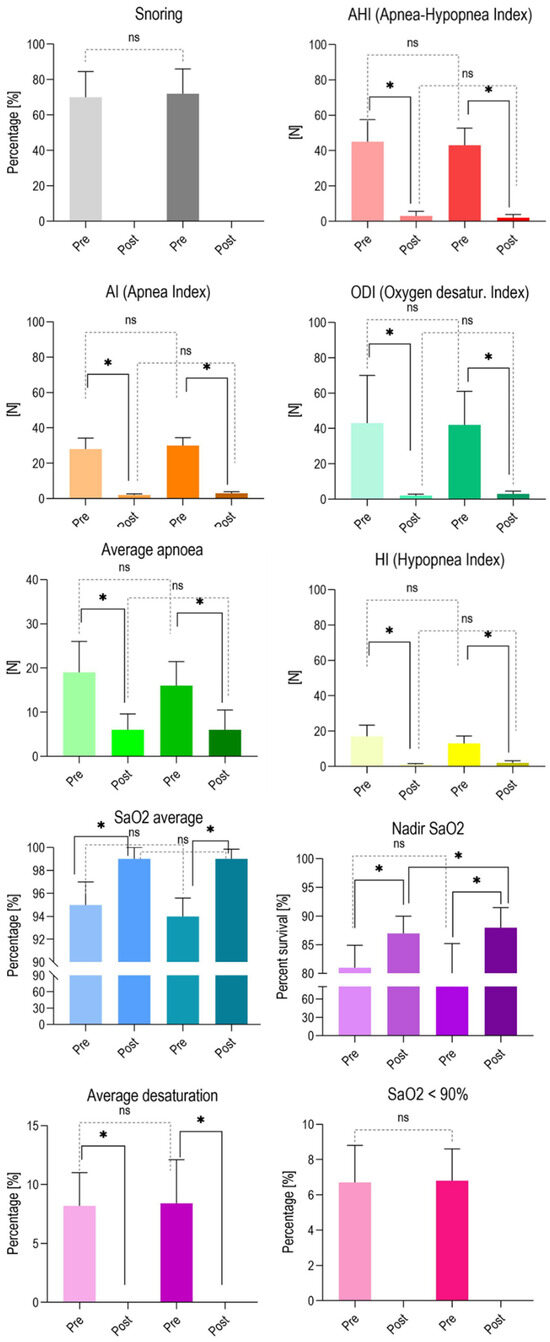 Comparison of the main respiratory and oximetry indices during sleep across the two phases of the study: before the intervention (Pre) and after (Post). The bar graphs show mean values ± standard deviation (or standard error). Significant reductions (* p < 0.05) are observed in parameters such as snoring, AHI, AI, ODI, and Hypopnea Index immediately after the intervention, with effects persisting over time. Oxygen saturation values (mean SaO2, SaO2 nadir, SaO2 < 90%) show improvements post-intervention. These results suggest a positive impact of the intervention on respiratory quality during sleep.