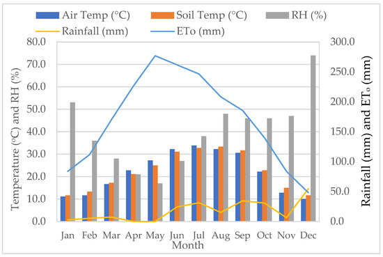 Average monthly air and soil temperatures (°C), relative humidity (RH%), total rainfall (mm), and reference ETo (mm) variations at Maricopa, Arizona during 2022 and 2023.