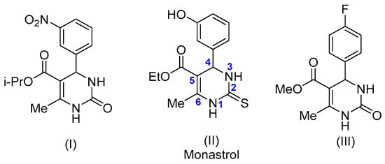 Nitrogen-containing heterocycles are one of the most significant and pharmacologically attractive classes of organic compounds. Within this group, pyrimidines hold particular significance, being a part of the structure of nucleic acids [6], vitamins (e.g., thiamine) [7,8], and numerous synthetic drugs [9,10]. A notable subclass of pyrimidine derivatives is dihydropyrimidinones (DHPMs) and their thione analogs [11]. These scaffolds have attracted considerable attention due to their wide-ranging therapeutic applications. Over the past century, DHPMs have been extensively investigated as calcium channel blockers (e.g., nifedipine analogs—compound (I) in Figure 1) [12,13], anticancer agents [14] (e.g., monastrol (II) [15], a selective mitotic kinesin inhibitor), and antimicrobial (III) [16,17,18] and anti-inflammatory [19] compounds.