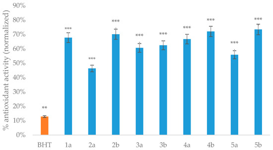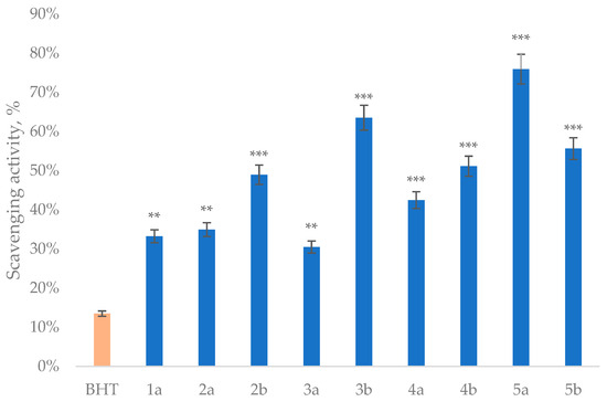 ABTS scavenging activity of the obtained compounds. Concentration of compounds was 50 µM (** p < 0.01, *** p < 0.001).