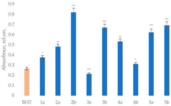 Ferric ion-reducing capacity of the obtained compounds. Concentration of compounds was 250 µM. The results are expressed as mean ± standard deviation compared to BHT (* p < 0.05, ** p < 0.01, *** p < 0.001).