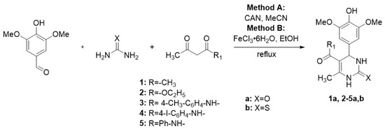 In this study, we successfully synthesized a series of dihydropyrimidinones and dihydropyrimidinthiones via the Biginelli reaction in acetonitrile using ceric ammonium nitrate (CAN) as catalysts (method A) and ferric chloride hexahydrate and in ethanol (method B) under reflux. The reaction was carried out using 4-hydroxy-3,5-dimethoxybenzaldehyde as the limiting reagent, with two equivalents of the appropriate dicarbonyl compound and three equivalents of either urea or thiourea, and 10 mol% of the catalyst. Acetylacetone, acetoacetic ester, and amides of acetoacetic ester (N-phenyl, N-para-tolyl, and N-para-iodophenyl) were used as dicarbonyl compounds (Scheme 1).
