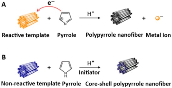 Illustration for the synthesis process of PPy nanofibers using (A) a reactive template and (B) a non-reactive template (reproduced from [18] under the terms and conditions of a Creative Commons Attribution-Non Commercial 3.0 Unported Licence).