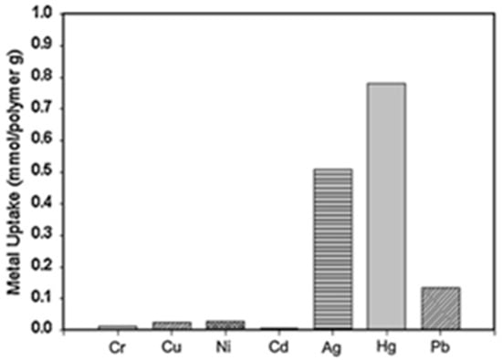 Although the fabrication process of these materials is not complex, their relatively low surface area leads to inefficient extraction of heavy metals from wastewater [88]. The alternative candidates for the role of efficient heavy metals sorbent are nanocomposites with enhanced, more developed surfaces. They can be classified into different classes, including PPy-metal oxide hybrids, PPy-carbon-based nanomaterials, and bio-template-assisted systems. In the PPy-metal oxide hybrids group, colloidal nanocomposites of PPy/hollow mesoporous silica (PPy/HMSNs) were characterized with enhanced adsorption of Cr(VI) ions from aqueous solutions [96]. Also, a PPy/silica nanocomposite obtained via templated synthesis was used as a sorbent for heavy metal ions (Hg2+, Ag+, and Pb2+) [97]. A bottom-up approach produced samples with a cratered surface, and using 4 mL of silica sol solution (Ludox SM-30) yielded the nanocomposite with the highest BET surface area of 306 m2/g. As determined using the BET method, the amount of loaded silica solution controls the surface areas of the PPy/silica nanocomposites, as it increased over three times after the addition of the silica component. The PPy/silica nanocomposite prepared with SM-30 silica solution (4 mL) exhibits a type IV-like N2 adsorption–desorption isotherm with hysteresis as typically shown by mesoporous-type materials [98]. The Barrett–Joyner–Halenda method, applied to the adsorption branch of the N2 isotherm, determined the pore size distribution with the same pore size as the PPy/silica nanocomposite, with an average silica particle size of 7 nm, as in the original silica [97]. The adsorption capacities of the PPy/silica nanocomposite indicated that the material exhibited a higher complexation affinity for several metal ions (termed as “soft”) (0.97 (Hg2+), 0.75 (Ag+), and 0.53 (Pb2+) mmol/g) than the ‘‘hard’’ metal ions (0.02 (Cu2+), 0.03 (Ni2+), 0.01 (Cd2+), and 0.01 (Cr3+) mmol/g) (Figure 2). The complexation reaction between specific ligands and target ions [99,100] governed the selectivity, as soft acids such as Hg2+ readily form stable complexes with soft bases like the secondary amines in pyrroles [97].