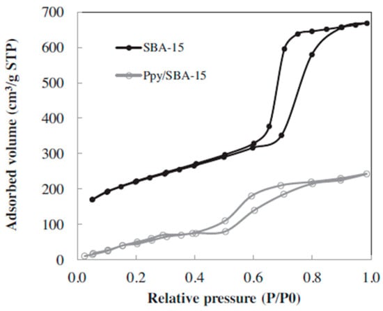 N2 adsorption/desorption isotherms of SBA-15 and PPy/SBA-15 (Reproduced with permission from [102]; published by Elsevier, 2016).