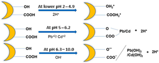 Proposed mechanism of the metal sorption: Pb(II) and Cd(II) (reproduced with permission from [75]; published by Elsevier, 2021).