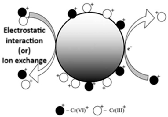 Rapid industrialization and population growth generate substantial volumes of wastewater containing heavy metal ions that degrade the aquatic environment [71]. Heavy metals are the cause of a significant environmental threat because they exhibit high toxicity and accumulate and biomagnify within biological systems [72]. Another consequence of heavy metal presence in the environment is their role in the disruption of the natural food chain via bioaccumulation [73,74]. Inorganic pollutants are characterized by traits like solubility, oxidation-reduction potential, and complex formation. Being discharged into water, they are converted to hydrated ions that disrupt the enzymatic process with enhanced absorption into the cell organism [75]. Methods like precipitation, electrochemical treatment, photocatalytic reduction, and adsorption have been utilized to reduce Cr(VI) [76]. Still, an adsorption method offers the most promising approach because it uses inexpensive, sustainable, and renewable materials as adsorbents [77].