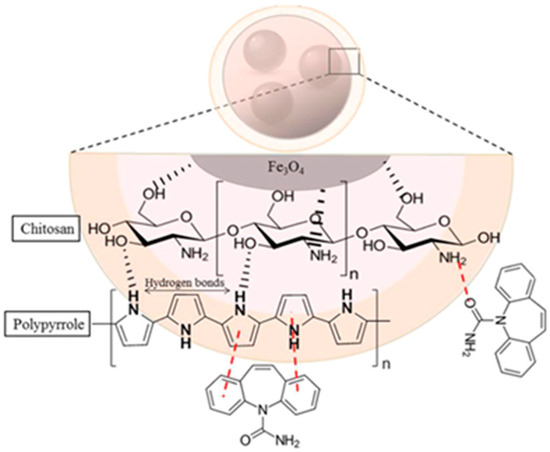 Schematic representation of the PPy-CS-Fe3O4 nanocomposite structure with proposed interactions (reproduced with permission from [143]; published by Elsevier, 2021).