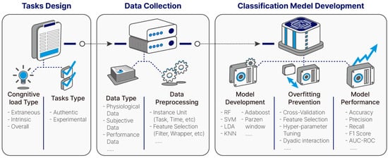 Data were extracted from all the eligible studies; our research focus was on methodological aspects of how cognitive load tasks were designed, what data was collected, and how classification models were developed. We developed a framework of classification model development (Figure 1) and coding scheme (Table 3) through supporting literature investigation and iterative testing and revision.
