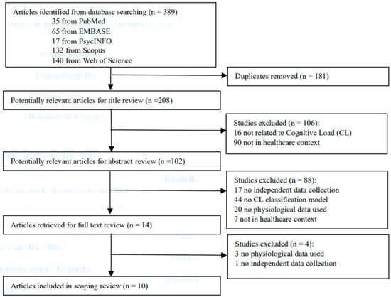 A total of 389 articles were identified in the five academic databases, with none found in gray literature. After removing 181 duplicates, 208 studies remained for title screening. Title review eliminated 106 studies, leaving 102 for abstract screening. Abstract review excluded 88 more, resulting in 14 studies for full-text assessment. Four studies were excluded during full-text review, leaving ten studies for final inclusion in this scoping review. Figure 2 details the exclusion process and reasons at each stage.