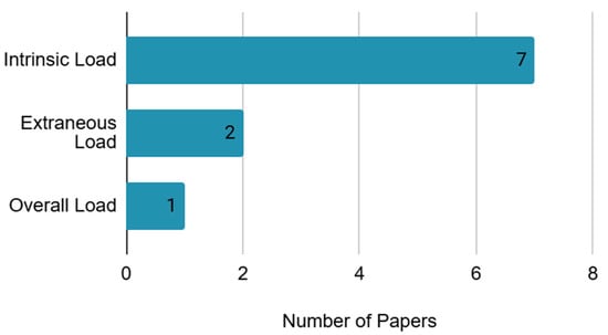 Among the ten studies reviewed, seven measured intrinsic load, two measured extraneous load, and one measured overall load as shown in Table 4 and Figure 3. Studies measuring intrinsic load manipulated the task difficulty by altering the components of the task to distinguish between high and low cognitive load. In contrast, studies employing extraneous load aimed primarily to induce fatigue or cognitive pathology by disrupting cognitive activities. These studies used secondary tasks unrelated to the primary task to induce extraneous load. Participants were required to perform commonly used cognitive load tasks such as the Operation Span Task (OSPAN) or elementary arithmetic tasks alongside the primary task to create irrelevant load. The study focusing on overall load did not manipulate the task difficulty or add additional tasks; instead, it aimed to measure the total cognitive load experienced by learners performing the task. It used subjective measurements to assess the learners’ overall effort and mental demands throughout the task, rather than manipulating tasks.