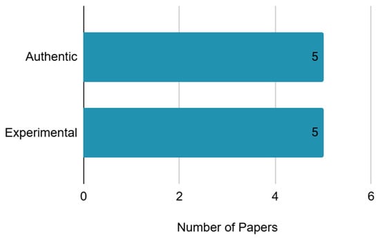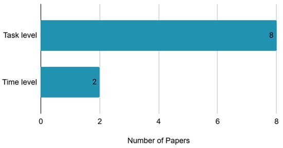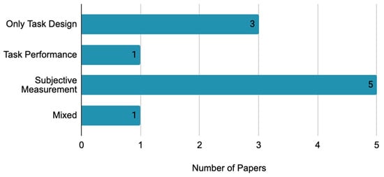 Out of the ten studies, three used only task design to measure cognitive load, the others validate the cognitive load with additional methods. Five used subjective measurement, and one of each used a mixed method, as shown in Table 5 and Figure 4. Of the five studies that used subjective measurement to verify whether the measured cognitive load is validated, four measured cognitive load with the NASA Task Load Index (NASA-TLX). The reason for using subjective measurement instead of task design was the concern that cognitive load levels of the same tasks could vary greatly depending on the individual and situation [5,29]. Lastly, there is one study using the mixed method based on the perceived task difficulty, task performance, and task design.