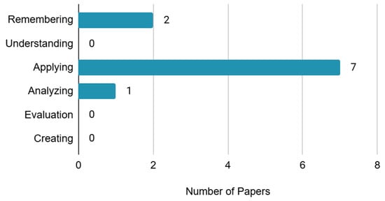 Additionally, the tasks used in the studies were categorized based on Bloom’s Taxonomy of cognitive learning [5,9], as shown in Table 6 and Figure 6. According to Bloom’s Taxonomy, tasks are divided into six levels: remembering, understanding, applying, analyzing, evaluating, and creating. Among the tasks, seven fell under the “applying” level, and two fell under the “remembering” level, and one fell under the “analyzing” level. The prevalence of tasks at the “applying” level is due to the inclusion of arithmetic tasks, which fall into this category.