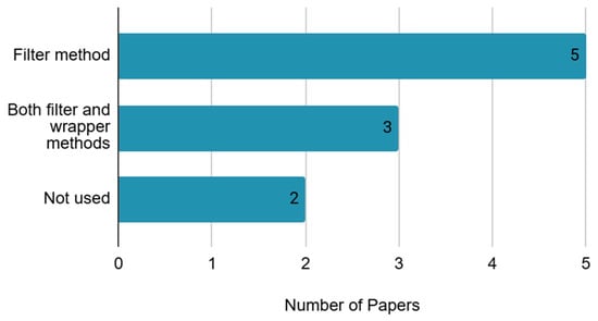 In terms of feature selection, five utilized only the filter method, three used both filter and wrapper methods, and the remaining two did not use any feature selection method, as shown in Table 8 and Figure 8. Specific filter methods employed included correlation analysis, Mann–Whitney-U test, principal component analysis (PCA), and independent component analysis (ICA). Wrapper methods used included recursive feature elimination (RFE) and forward feature selection (FFS).