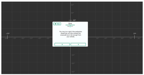 The questionnaire items used to evaluate the usability and learning effectiveness of the VR-based driver safety training prototype are presented in Table 2 and Table 3, respectively. The questionnaire items for usability, presence, aesthetics, and learning effectiveness were designed with reference to prior studies [32,33,34,35]. The items of sickness were developed based on the virtual reality sickness questionnaire (VRSQ) [36] and simulator sickness questionnaire (SSQ) [37].