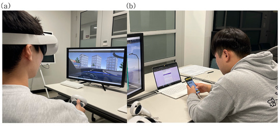 The experiment was conducted in a university laboratory using a head-mounted display (HMD), the Oculus Quest 2. Each participant interacted with both the developed VR-based prototype via the Oculus Quest 2 and the mobile-based Driver Safety Education Application using a Galaxy S24 device. The mobile application used in this study was Driver’s License PLUS, an extensively recognized traffic law education app that provides quiz-based learning using text, photos, and videos. It was selected due to its suitability for comparing the usability and learning effectiveness of driver safety education between mobile and VR devices.