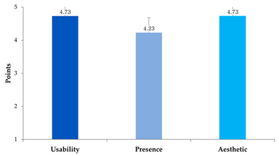 33. Witmer, B.G.; Singer, M.J. The factor structure of the presence questionnaire. Presence Teleoperators Virtual Environ. 2005, 14, 298–312. [Google Scholar] [CrossRef]