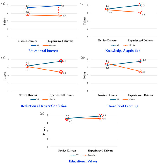 Figure 6. Average user evaluation scores for (a) educational interest, (b) knowledge acquisition, (c) reduction of driver confusion and (d) transfer of learning, and (e) educational values, analyzed by device type and driving experience. Distinct circles indicate statistically significant differences, whereas points within the same circle do not significantly differ.