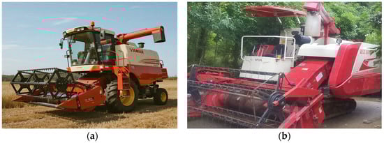 Crawler-type full-feed rice combine harvester (a). Japanese Yanmar 4LZ-2.8 (b). Chinese Leiwo Gushen 4LZ-5G tracked full-feed rice and wheat combine harvesters.