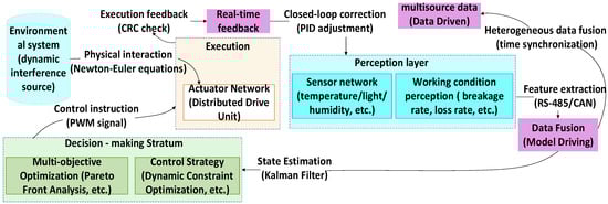 Intelligent control of grain combine harvesters relies on a three-layer closed-loop architecture comprising “perception, decision, and execution.” This architecture (Figure 2) achieves efficient operation in complex farmland environments through the synergistic integration of multi-source data fusion technology, dynamic optimization algorithms, and precise actuators. The specific architecture is as follows: