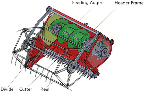 The structure of the cutting table (Figure 3) consists of four functional units: the grain separator, the cutter, the pivot unit, and the conveyor. The cutting process proceeds as follows: The separator first distributes the crop and directs it to the cutting area. The pivot wheel and pivot plate holder then advance the crop to the cutting position. The cut crop is conveyed to the threshing mechanism via a screw conveyor [34].