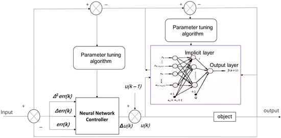 where is the output of the system at moment k (e.g., threshing drum speed); is the output of the controller at moment k (e.g., motor control volume); is the inverse dynamics neural network model.