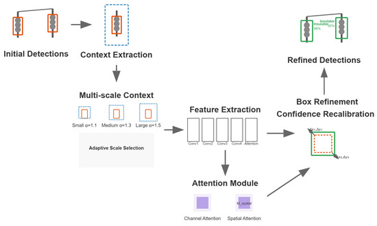 - Adaptive multi-scale context extraction: Introduces a size-aware strategy that dynamically adjusts the contextual region based on the relative object area, improving the detection of small, partially occluded, or low-contrast faults in high-voltage insulators.