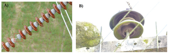 Figure 4 presents examples of insulators considered in this study. Figure 4A shows an insulator chain with insulators in different conditions (we highlighted in red a broken insulator and in green an insulator in good condition) [31]. Figure 4B shows an insulator with contamination on its surface and in the structure that supports the insulator.