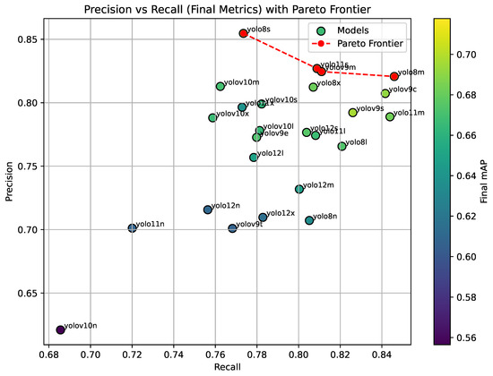 The baseline evaluation identified yolo8m as achieving the highest initial performance with 0.718 mAP. Pareto frontier analysis revealed four configurations (yolo8s, yolov9m, yolo8m, and yolov9c) that provide optimal precision–recall trade-offs, with no other models simultaneously improving both metrics.