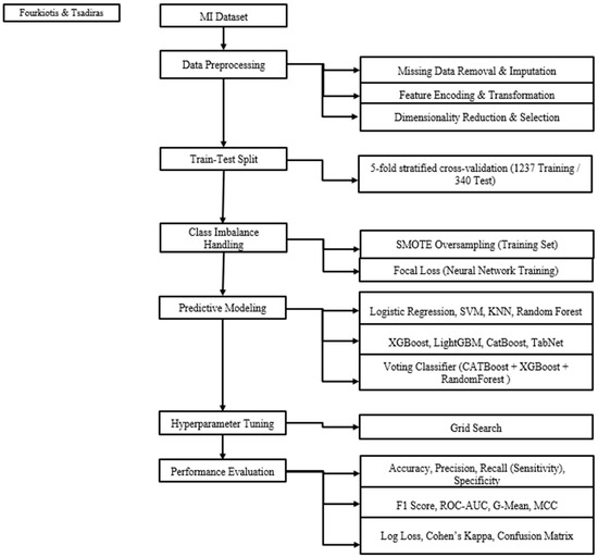 Prior studies have used the same publicly available myocardial infarction dataset for related prediction tasks but employed limited preprocessing and imbalance handling. Diakou et al. [11] applied multi-label classification (e.g., One-vs-Rest with XGBoost) to predict complications, but without deep imputation, advanced normalization, or structured imbalance control. Joshi et al. [12] achieved high F1 scores using classical algorithms such as Ridge Classifier and SVC, yet relied only on median imputation, mutual information feature selection, and no balancing or normalization. Reddy and Thangam [13] predicted relapse risk using resampling methods such as SMOTE and SVM-SMOTE, but they lacked deep preprocessing and model-specific optimization.
