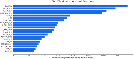 To enhance the interpretability of the models, a post hoc feature importance analysis was performed using the Random Forest classifier. After training the models on the reduced feature set determined by the preprocessing pipeline, the fitted Random Forest model was used to extract impurity-based importance scores for each variable. The top 20 most influential features are shown in Figure 2. Myocardial rupture indicator RAZRIV was the most highly ranked variable, followed by serum potassium (R_AB_3_n) and sodium (NA_R_3_n) levels on day three, which are biomarkers known to affect post-infarction outcomes. The NOT_NA_3_n flag, indicating abnormal sodium levels, reinforced the clinical relevance of electrolyte disturbance in mortality risk. The ZSN_A angiographic stenosis score, reflecting residual coronary obstruction, was also ranked highly. Collectively, these features represent major clinical dimensions such as structural integrity, fluid–electrolyte balance, and ischemic burden. This post hoc analysis not only improved the interpretability of the pipeline but also highlighted clinically meaningful predictors that could inform risk stratification and decision support in real-world settings.