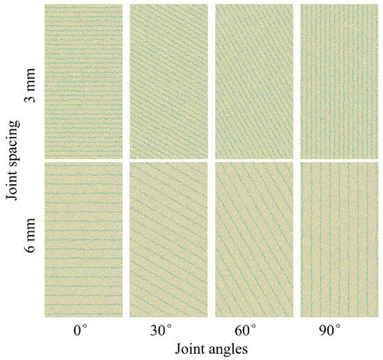 DEM modeling of coal with different joint spacing and angles. (Yellow represents the parallel bonding model between matrix particles, blue represents the smooth joint model of joints, and gray represents material particles.)